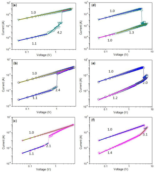 Fitting curves for the binary biomemristic behaviors with different content of GQDs 1 wt%, 3 wt% and 5 wt%, respectively, during the (a–c) SET and (d–f) RESET process.
