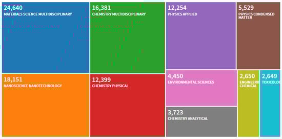 Record count per discipline of the number of papers published between 2000 and 2020 indexed in the Web of Science using “AMPs and Nanoparticles or Nanomaterials” as keywords (date of search; 12th March 2020).