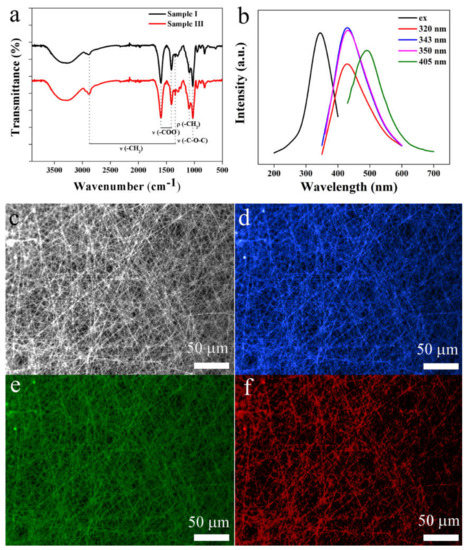 Fluorescence properties, especially excitation-dependent-emission (EDE) fluorescence, are a very important advantage of CDs. To determine whether the fluorescence property of CDs was preserved by the nanofibres, fluorescent spectra of sample III were collected. As shown in Figure 3b, the optimal excitation and emission of the nanofibres appeared at 343 nm and 430 nm, respectively, and both slightly blue-shifted from the 360 nm and 443 nm of the original CDs [21] because the change in the surface state of the CDs when incorporated into the nanofibres affected the band gap. The emission barely changed when excited from 320 nm to 350 nm but red-shifted to 495 nm when excited by 405 nm, showing typical EDE fluorescence. EDE could be further verified by the CLSM images. As shown in Figure 3c, straight, homogeneous, and evenly distributed nanofibres could be clearly observed. When exposed to light of 405, 488 and 561 nm, bright and homogenous emission with blue, green, and red colours were observed, respectively. It should be noticed that the azure emission colour of Figure 3d exactly coincided with the maximum emission wavelength of 495 nm in Figure 3b after both exposed to the 405 nm. Moreover, the uniform emission indicated that the CDs were uniformly dispersed in the nanofibres. The bright and EDE fluorescence make the nanofibres good candidates for anti-counterfeiting, bioimaging, medical diagnosis, and so on.