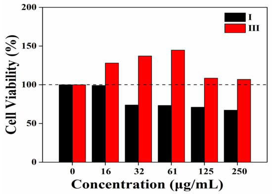 To determine the application potential of in the field of biomedicine, the cytotoxicity and biocompatibility of SA nanofibres were studied. In vitro cytotoxicity assessment of SA nanofibres (sample I) and SA/CDs nanofibres (sample III) were evaluated by using MTT analysis with L-929 fibroblasts. As shown in Figure 4, for sample I, the cell viability was over 99% at the low concentration of 16 μg/mL, but gradually decreased when the concentration increased and kept steady at about 70%, revealing relatively low toxicity towards the cells. However, for sample III, the cell viabilities were over 100% compared to the control group at all concentrations and it increased first and then decreased with the increase of concentration, and arrived the maximum of 144% at 61 μg/mL. The results showed that SA/CDs nanofibres were not only non-toxic and well biocompatible, but also could promote the cell proliferation, making them good candidates to be used as wound dressing. Based on the different cell viabilities of sample I and III, the cell proliferation effect was deduced to be benefited from CDs, which had abundant active sites provided by the amino and hydroxyl groups, through which other biocompatible components such as proteins, cell growth factors, or peptides could be further immobilized [23].
