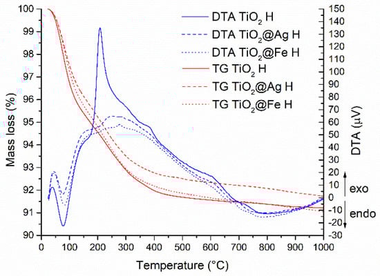 According to Figure 1, on the ATD curve, around the temperature of 100 °C, an endothermic effect determined by the evaporation of the water used for synthesis was observed and also the evaporation of isopropanol from the sample which is accompanied by a mass loss effect. The exothermic effect correlated with an observed mass loss between 200 and 300 °C is due to the degradation of the excess titanium precursor (TTIP).
