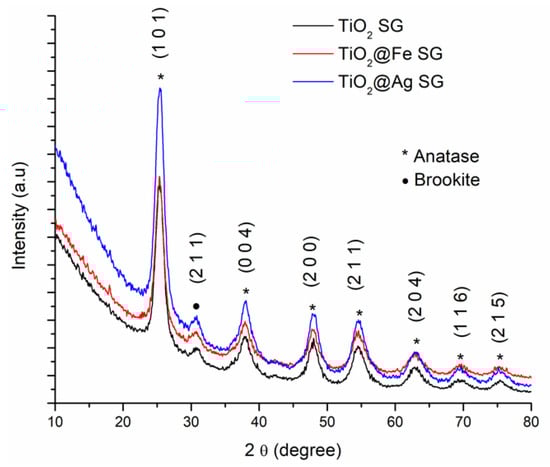 Among these enhancing metal materials, Ag has a certain photocatalytic ability, some advantages of raw material preparation and cost, and it is considered to be a material that has a prospect of industrial application [,]. However, it was found that excessive enhancing with silver may decrease TiO2 photocatalytic activity because it occupies active sites on its surface []. When discussing about Fe-enhanced TiO2, several studies highlight the influence of iron atoms on the oxide, dependent of its crystal structure (i.e., production of more oxygen vacancies in anatase than in rutile), generally enhancing the photocatalytic activity of TiO2 powders and thin films [,,].