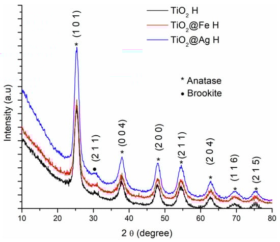 For the microwave-assisted hydrothermal method the ratio TTIP:H2O = 1:100 was used. The general steps implied in this type of synthesis were previously described by Paduraru et al. []: Particularly, the precursors for Ti and Ag/Fe, along with distilled water and nitric acid, were weighed and transferred into Teflon vials. Afterwards, the vials (placed in a rack) were automatically pulled down into the reaction chamber, sealed and pre-pressurized with nitrogen. The obtained reaction mixtures were then subjected to a microwave-assisted hydrothermal treatment of 10 min, at 200 °C and the pressure of 20 bars, then cooled to room temperature. After the autoclaving process, the samples were centrifuged and washed several times with distilled water until obtaining a neutral pH and dried in the oven at 45 °C for 72 h.