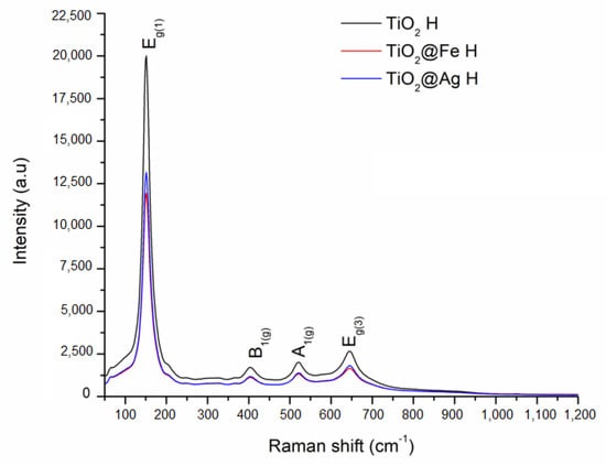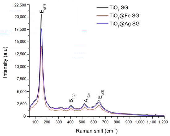 The Raman bands are found at 153, 407, 521, and 642 cm−1 for the samples obtained by the sol-gel method and at 151, 404, 521, and 644 cm−1 for the samples obtained by the hydrothermal method. The above mentioned vibrational modes are specific to the anatase phase of titania. At the same time, in the case of enhanced samples obtained by both methods of synthesis, a decrease in intensity is observed. This data suggests the presence of Ag/Fe in the structure of the obtained samples. Also, no other bands specific for silver oxide or iron oxide have been identified through the Raman technique [].
