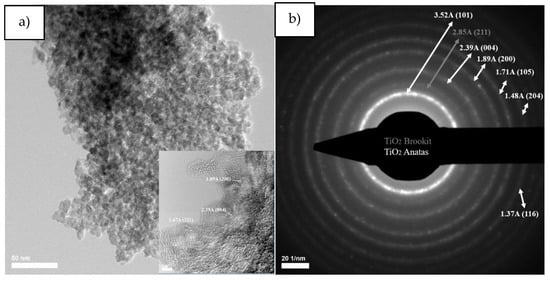 Transmission electron microscopy images for titanium dioxide powder obtained by the sol-gel method (Figure 8) reveal a polyhedral morphology with rounded corners, and selected area electron diffraction reveals diffraction rings specific to the interplanar distances of (1 0 1), (0 0 4), (2 0 0), (1 0 5), (2 0 4), (1 1 6) planes for titanium dioxides in the form of anatase and diffraction rings specific to interplanar distances for the (2 1 1) plane for titanium dioxide in the form of brookite.