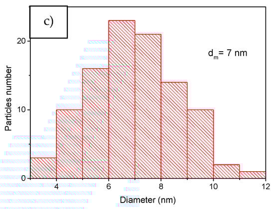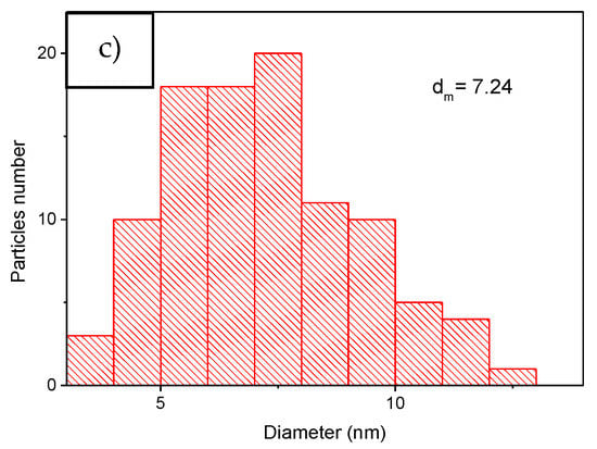 Transmission electron microscopy images for the Fe-enhanced sample (Figure 9) reveal a spheroidal morphology, and electron diffraction on selected area highlights the diffraction rings specific to interplanar distances for the (1 0 1), (0 0 4), (2 0 0), (1 0 5), (2 0 4), (1 1 6), (2 1 5) planes for titanium dioxide in the form of anatase and diffraction ring specific to interplanar distances for the (2 1 1) plane for titanium dioxide in the form of brookite. According to the histogram the average particle size is 7 nm, the largest statistics being in the diameter range of 6–8 nm.