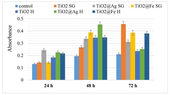 It is observed that after the first 24 h, the best answer is given by the silver-enhanced samples. This result is most likely due to the antimicrobial activity of silver. After 48 h, all values are increasing compared to control, but after 72 h most values approach the value of the control. The results obtained after 72 h may be a consequence of the release of nanoparticles from cells.