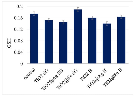 For this analysis, AFSC were seeded at a density of 3000 cells/well in 300 µL DMEM, supplemented with 10% fetal bovine serum and 1% antibiotics (penicillin, streptomycin/neomycin) in plates with 96 wells. After 24 h of seeding, the cells were treated with the synthesized Ag/Fe-enhanced TiO2 powders and incubated for 72 h. The GSH-Glo Glutathione Assay kit (Promega, WI, USA) was used for oxidative stress assessment. The kit measures the amount of glutathione (GSH) that is produced by cells and converted to oxidized glutathione. The amount of glutathione transformed is directly proportional with the amount of glutathione S-transferase (GST) enzyme that catalyzes the oxidation reaction, which is also linked to the formation of a luminescent luciferin. If the light emission is poor, glutathione production is inhibited and thus oxidative stress is increased, while in the case of an intense light, more glutathione has been synthesized and thus the cell is less stressed.