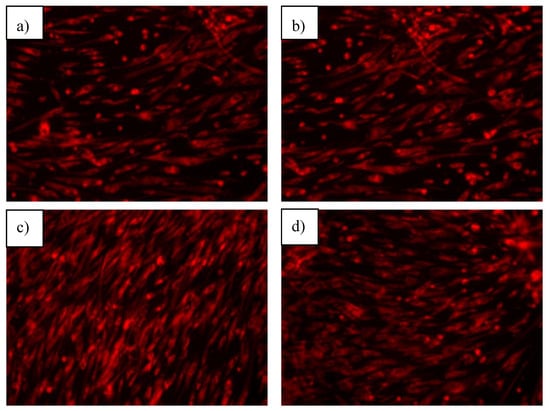 The biocompatibility of the obtained Ag/Fe-enhanced TiO2 powders with AFSC was also evaluated based on fluorescence microscopy using RED CMTPX fluorophore (Thermo Fischer Scientific, Massachusetts, MA, USA), which is a cell tracker for long-term tracing of living cells. The CMTPX tracker was added in cell culture treated with the nanoparticles and the viability and morphology of the AFSC was evaluated after 5 days. The CMTPX fluorophore was added in the culture medium at a final concentration of 5 µM, incubated for 30 min in order to allow the dye penetration into the cells. Next, the AFSC were washed with PBS and visualized by fluorescent microscopy. The photomicrographs were taken with Olympus CKX 41 digital camera driven by CellSense Entry software (Olympus, Tokyo, Japan) [,].