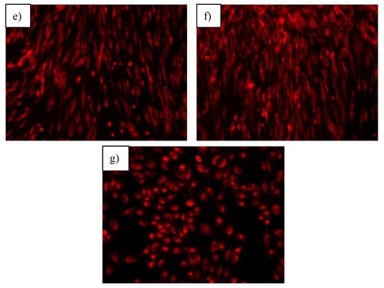 Fluorescence microscopy images of the cells that interacted with the samples (a) TiO2 SG, (b) TiO2 H, (c) TiO2@Ag SG, (d)TiO2@Ag H, (e) TiO2@Fe SG, (f) TiO2@Fe H, (g) Control sample.
