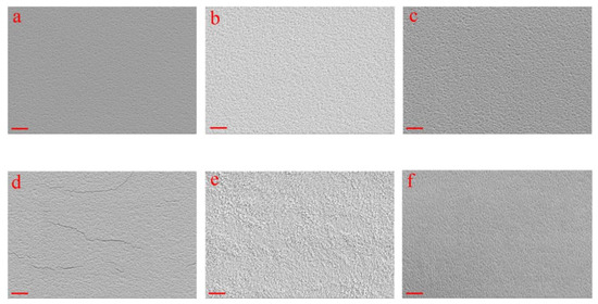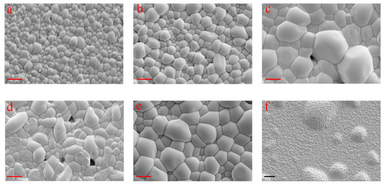 Scanning electron microscope (SEM) top-view images of as-deposited Sb2Se3 thin films sputtered under 2.0 Pa (a), 1.5 Pa (b), 1.0 Pa (c), 0.5 Pa (d), 0.1 Pa (e), and mixed pressures (f). The red scale bar at the left bottom corner of each figure reads 1 µm.