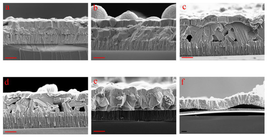SEM cross-sectional images of Sb2Se3 devices sputtered under 2.0 Pa (a), 1.5 Pa (b), 1.0 Pa (c), 0.5 Pa (d), mixed pressures (e), and 0.1 Pa (f). The red scale bars at the left bottom corner of (a–e) read 1 µm. The black scale bar at the left bottom corner of (f) reads 2 µm.