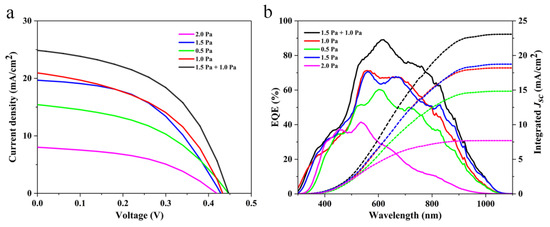 Device performances. Current density–voltage (J–V) curves (a), and external quantum efficiency (EQE) and integrated JSC (b) of Sb2Se3 devices fabricated under various working pressures.