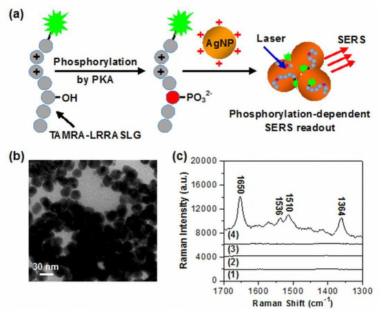 Herein, we report a phosphorylation-dependent SERS readout strategy for protein kinase A (PKA) activity assay using spermine-functionalized silver nanoparticles (AgNPs). Phosphorylation by PKA would alter the net charge state of the specific substrate labeled with Raman dye 5-carboxytetramethylrhodamine (here referred to as TAMRA-LRRASLG), and the resulting anionic products could absorb onto aggregated AgNPs with a cationic surface charge through electrostatic attraction in assay buffer. Thus, the signals of TAMRA labeled on peptides would be remarkably enhanced due to the close proximity of interparticle hot spots. Herein, we showed how the positively charged AgNPs were particularly suitable as SERS platforms for PKA activity assay. It is expected that the dependence of phosphorylation on SERS readout can help reduce background signals originated from the directly dye-labeled nanoparticles [27] and avoid false positive results, which is favorable for the sensitive and reliable assay of the activity and inhibition of PKA in cell extracts. Considering recent progress in the synthesis and cellular uptake of functionalized nanoparticles [39,40], and studies on protein–nanoparticles interaction [41], there will be a strong driving force to expand the SERS strategy to real-time monitoring of the specific kinase activity in living cells in future.
