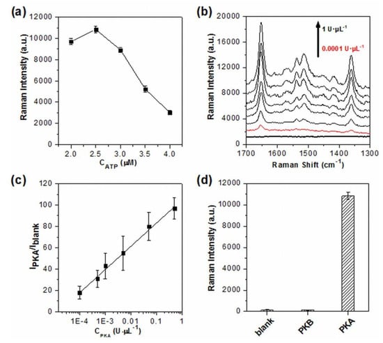 Considering that the excessive free ATP may compete with phosphorylated TAMRA-LRRASLG for AgNPs, the effect of ATP concentration on SERS readout was carefully investigated (Figure 2a). When the concentration of ATP was higher than 2.5 μM, a significant decrease of SERS signal intensity was observed. The same results were obtained by the use of the synthetic phosphorylated products instead of TAMRA-LRRASLG phosphorylated by PKA (data not shown). These indicated that PKA was saturated with the employment of 2.5 μM ATP and excess of such concentration would affect the assaying performance due to the competition binding to AgNPs between free ATP and phosphorylated products, which is consistent with the results reported by fluorescence [44]. To obtain enhanced signals, and to avoid the negative effect of free ATP on phosphorylated peptides/AgNPs interaction, 2.5 μM ATP was employed in the following assay unless otherwise noted.