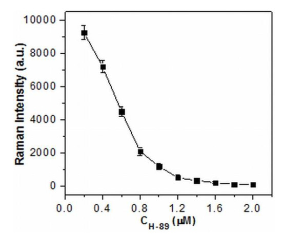 SERS intensity of 1650 cm−1 as a function of the concentration of PKA inhibitor H-89 (experimental conditions: TAMRA-LRRASLG, 1 μM; PKA, 1.0 U·μL−1; H-89, 0-2 μM).