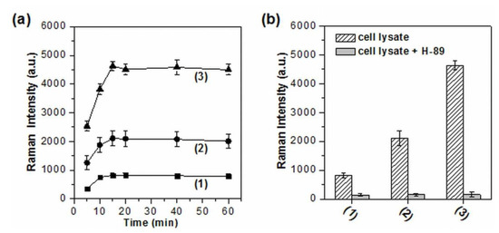 The sensitivity and applicability of this system were further demonstrated by assaying the activity and inhibition of PKA in real biological samples particularly in cell extracts. HeLa cells, taking for example, were first treated by different concentrations of forskolin and 3-isobutyl-1-methylxanthine (IBMX), which have been demonstrated as effective at stimulating drugs for the activation of cAMP-dependent PKA [45,46]. The effect of various ions and salts existing in cell extracts on the aggregation of AgNPs was first examined by UV-vis spectroscopy. The characteristic absorption band of aggregated AgNPs was still able to be observed and the corresponding intensity had little or no change after AgNPs were added in the cell lysate solution and incubated for up to 60 min (Figure S4). That is to say, no obvious nanoparticle precipitation occurred in the assay solution. Then, the activity and inhibition of PKA in cell extracts were monitored by the phosphorylation-dependent SERS assay. Interestingly, even without drug stimulation, the distinguishable SERS signals from the extracts were able to be detected due to the presence of PKA in HeLa cells (Figure S5), which has been demonstrated by electrophoresis [47] and fluorescence [18]. Meanwhile, the drugs stimulated cell lysates all aroused obviously enhanced Raman signals, which gradually increased with the concentration of forskolin and IBMX (Figure 4a). Notably, the SERS signal intensity at 1650 cm−1 reached a plateau when the incubation time was longer than 15 min and the stable SERS intensities kept almost identical for up to 60 min, suggesting the good stability of spermine-functionalized AgNPs over long periods of time. Moreover, all of these signal enhancements were effectively suppressed by H-89 (Figure 4b). These results indicate that the phosphorylation-dependent SERS assay is feasible and reliable for in vitro assessment of PKA activity and its variation in real biological samples.