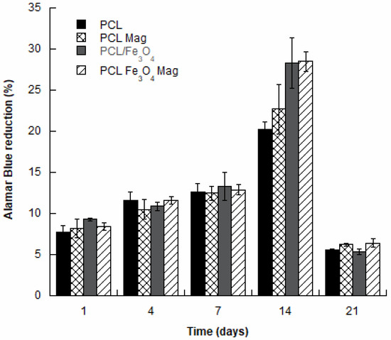 Percentage of Alamar Blue reduction evaluated for PCL, PCL/Fe3O4, PCL Mag and PCL/Fe3O4 Mag at different time points.