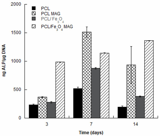 On the other hand, the effect of the magnetic stimulation on PCL/Fe3O4 led to the highest ALP activity at 3 days, as well as an increasing trend over time (see PCL/Fe3O4 Mag).