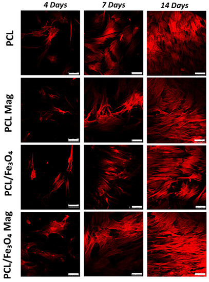 In addition, for each material (PCL or PCL/Fe3O4), the applied time-dependent magnetic field differently influenced the behavior of hMSCs over time, since the ALP/DNA ratio peaked at 7 days for PCL Mag, as with all the unstimulated substrates, whereas the magnetic stimulation led to increasing levels of ALP activity in the case of PCL/Fe3O4 (see PCL/Fe3O4 Mag in Figure 4), also resulting in a prolonged differentiation.