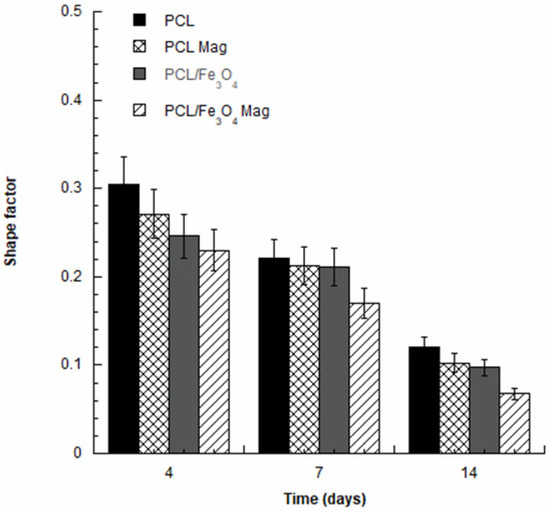 Comparing the different cell-laden substrates at 7 and 14 days, the lower values of the cell shape factor for the magnetically-stimulated PCL/Fe3O4 nanocomposites were consistent with the results from the normalized ALP activity, justifying the differences found in the differentiation process.
