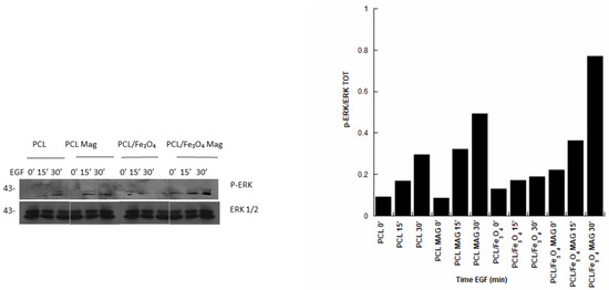 Specifically, the possibility to activate the MAPK pathway was demonstrated for both magnetically-stimulated and unstimulated PCL and PCL/Fe3O4 substrates in the presence of EGF (Figure 7).