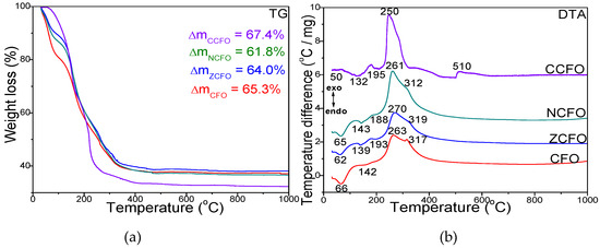 Thermogravimetric (TG) (a) and differential thermal analysis (DTA) (b) diagrams of CFO, ZCFO, NCFO, and CCFO dried at 40 °C.