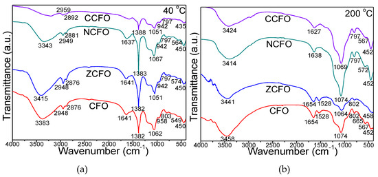 Fourier transform infrared spectra of CFO, ZCFO, NCFO, and CCFO samples heated at 40 (a) and 200 °C (b).