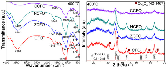 Fourier transform infrared spectra (a) and X-ray diffraction patterns (b) of CFO, ZCFO, NCFO, and CCFO annealed at 400, 700, and 1000 °C.
