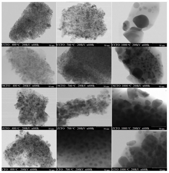 Transmission Electron Microscopy (TEM) images of CFO, ZCFO, NCFO, and CCFO annealed at 400, 700, and 1000 °C.