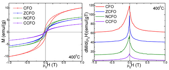 The magnetic hysteresis loops and the magnetization derivatives (dM/d(μ0H)) of CFO, ZCFO, NCFO, and CCFO NCs, annealed at 400, 700, and 1000 °C are presented in Figure 5. Most of our NCs show a superparamagnetic behavior with low Hc values. At 400 °C, the largest magnetizations values were found for CFO, while the doping with Zn2+, Ni2+, and Cu2+ ions depreciate the magnetic properties. At higher annealing temperatures, the introduction of the non-magnetic Zn2+ ions in the Co-ferrite, leads to the increase of magnetization [23]. Almost all the derivatives of the hysteresis loops have small and broad peaks, indicating partially crystalline samples containing a large number of dislocations and other crystal defects. The peak height decreases with decreasing annealing temperature.