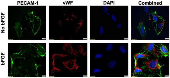 Immunostaining of angiogenic markers in Human Umbilical Vein Endothelial Cell line (HUVECs). Cells were stained with Platelet Endothelial Cell Adhesion Molecule-1 (PECAM-1) (green), vWF (red) and nucleus with DAPI (blue). The expression of PECAM-1 and von Willebrand Factor (VWF) is evident in HUVECs regardless of basic Fibroblast Growth Factor (bFGF) exposure.