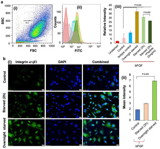 Expression of αvβ3 by HUVECs under different conditions (a) Flow cytometry analysis demonstrated significant expression of integrin αvβ3 in overnight starved cells. (i) Side scatter (SSC) vs. forward scatter (FSC) plot used to gate live cells and resulting (ii) histograms from which αvβ3 expression was (iii) quantified for different culture conditions. Colors in (ii) match the conditions shown in the x-axis of (iii). Values were expressed as mean ± SD, n = 3. p < 0.005 was considered significant. (b) Immunostaining was performed by (i) staining HUVECs with anti-human CD51/CD61 antibody to detect integrin αvβ3 (green). Nuclei were stained by DAPI (blue). Integrin αvβ3 expression was highest under overnight starved conditions when compared to control and 2 h starvation. (ii) Quantification of the images in (i) obtained using Image J. Value was expressed as mean ± SD, n = 3. p < 0.05 was considered significant.