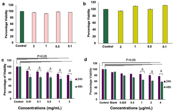 Comparison of HUVEC viability in the presence between aANGP-MCs and free form peptide as assessed by MTT assay. (a) Graph showing cell viability after treatment with aANGP without overnight starvation and (b) after treatment with aANGP with overnight starvation using 10 ng/mL of VEGF. (c) Viability results obtained after treatment with free form aANGP and (d) with aANGP-MCs after 24 and 48 h. Δ-Significance between the samples at 24 and 48 h. Values were expressed as mean ± SD, n = 3. Δ p < 0.05.