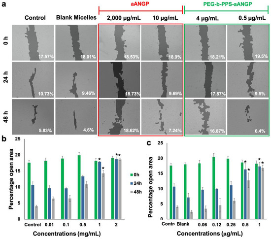 Migration is a crucial event in the process of angiogenesis. The effect of aANGP and aANGP-MCs on inhibition of migration was evaluated by wound healing assay after treatment with aANGP and PEG-b-PPS for 24 and 48 h. Figure 5a shows the migration of HUVECs when treated with different concentrations of aANGP and aANGP-MCs. The images showed inhibition in migration at 2000 μg/mL of aANGP compared to only 4 μg/mL of aANGP MCs at 24 and 48 h. Figure 5b,c shows the quantified data represented in a bar graph where the x-axis represents the different concentrations of aANGP in free form or present on aANGP-MCs. Significant (p < 0.005) inhibition in the migration of the HUVECs at 2000 μg/mL (18.73 ± 0.69%—24 h and 18.62 ± 0.39%—48 h) and 1000 μg/mL (17.89 ± 0.12%—24 h and 14.2 ± 0.93%—48 h) aANGP treated cells was observed when compared to the control (10.7 ± 0.93%— 24 h and 4.08 ± 0.87%—48 h) at 24 and 48 h. In the case of aANGP-MCs, the inhibition was evident (p < 0.005) at 4 μg/mL (17.32 ± 1.31%—24 h and 16.87 ± 0.86%—48 h) and 2 μg/mL (16.33 ± 1.91%—24 h and 12.78 ± 2.39%—48 h).