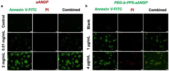 Apoptosis Assay: In order to evaluate the mechanism by which the cells are undergoing death, apoptosis assay was performed by staining the cells with Annexin V-FITC and Propidium Iodide (PI). Briefly, 1 × 106 cells/well were seeded in a 6-well plate coated with denatured collagen and allowed to become confluent. The next day the cells were starved overnight with 0.5% FBS in DMEM with 20 ng/mL of bFGF. The cells were then treated with different concentrations of aANGP and PEG-b-PPS-aANGP and incubated at 37 °C for 24 and 48 h. The cells were then stained with Annexin V-FITC and PI by following the procedure provided in the PE Annexin V Apoptosis Detection Kit I (BD Biosciences, USA Cat No. 559763). Assessment of the cells for apoptosis was performed by using Confocal microscopy, and FACS Caliber (BD Biosciences, San Jose, CA, USA), and the data were analyzed using FlowJo (FlowJo v10.6.2, LLC,, California, USA).