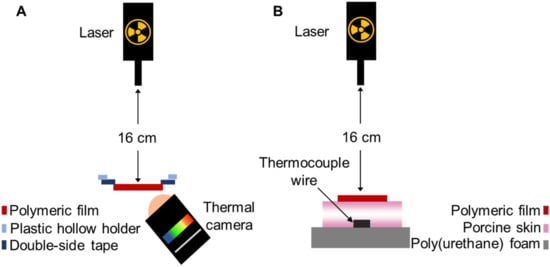 Experimental setup for thermal studies of gold-nanorod-loaded (GnR-loaded) films (A). Distance between laser and films was kept at 16 cm. Laser wavelength was 808 nm, with a power of 2W, and film irradiation lasted for 15 s. Experimental setup for thermal studies using neonate porcine skin (B). The distance between the laser and polymeric film was kept at 16 cm. Thermocouple wire was placed underneath the porcine skin. The laser wavelength was 808 nm, with a power of 2 W, and films irradiation lasted for 15 s.
