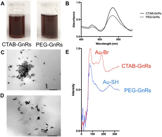 GnRs were prepared using a previously reported seed-mediated growth method [], where small gold nanoparticle seeds were added to an aqueous growth solution consisting of a mixture of ionic silver, ionic gold (AuCl4−), weak reductant (ascorbic acid), and surfactant (CTAB). CTAB has been proven to cause cytotoxicity, complicating the use of GnRs for biomedical applications []. Hence, samples of CTAB-GnRs were taken and the CTAB was removed by functionalization with mPEG-SH. Figure 3 shows prepared GnRs, as well as their absorption spectra.