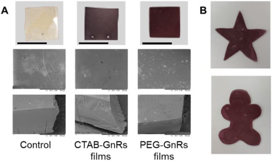 Representative digital and SEM images of polymeric films with GnRs (A). Polymeric films cut before crosslinking (B) (scale bar on digital images represent 1 cm).
