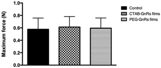 To investigate whether or not GnRs could have an effect on the mechanical properties of polymeric films, a texture analyzer was used to assess force at the break. Results for this test are shown in Figure 5. When a force of around 30 N was exerted on control films, they broke. Similarly, films including either CTAB or PEG-GnRs showed no significant difference (p < 0.05) in this value, suggesting that crosslinking of acid groups of poly(methyl vinyl ether-maleic acid) with alcohol groups of poly(ethylene glycol) was not altered by the presence of GnRs.