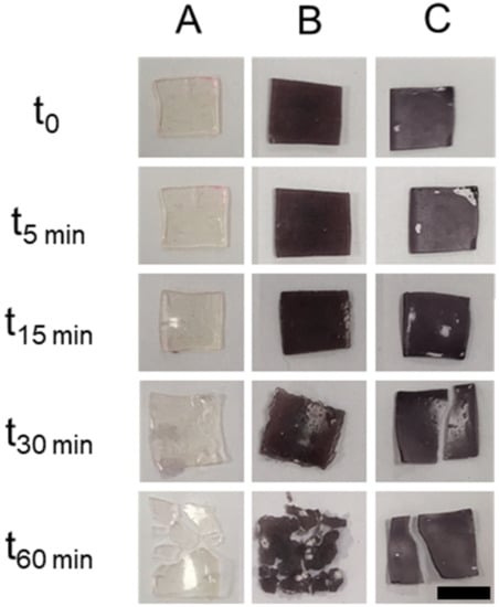 Films broke into smaller pieces during the swelling studies (Figure 7), and so the percentage of swelling could not be studied. However, pictures at different times show that after 5 and 15 min of immersion, films did not increase in size significantly. After 15 min, films start breaking into smaller pieces. A low molecular weight crosslinking agent was used, and so a highly crosslinked networked was obtained, however the films were quite thin. Then, when exposed to an excess of water, the structure collapsed and broke. The study presented here aimed to observe the swelling behaviour of films only, and so an excess of water was used; however, the setup does not represent what would happen when the films are placed on top of skin.