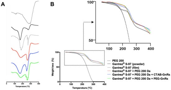 Thermal analysis of PEG 200 Da, Gantrez® S-97, and crosslinked films made with CTAB and PEG-GnRs: Differential scanning calorimetry (DSC) (A), thermogravimetric analysis (TGA) (B).