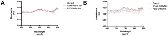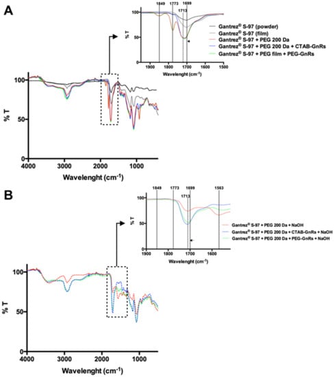 Figure 9A shows the spectra of Gantrez® S-97 powder and films formulated with this excipient, PEG 200 Da, and GnRs. When the carbonyl region of the spectrum (2000–1500 cm−1) is observed in detail, it can be seen that both the pure polymer and a film made only from the polymer showed peaks at 1699 cm−1, which can be assigned to the acid carbonyl groups. When the polymer was mixed with PEG 200 Da, the peak at 1699 shifted to 1713 cm−1, indicating crosslinking by an esterification reaction between acid groups in Gantrez® S-97 and the terminal hydroxyl groups from the PEG chains. The same peak is appreciated when both CTAB and PEG GnRs where included in the formulation, suggesting that their presence did not affect the crosslinking process. Peaks at 1773 and 1849 cm−1 could be attributed to the formation of anhydride groups between adjacent acid groups in Gantrez® S-97. Furthermore, films were immersed in NaOH 5M, dried, and the IR spectrum was once again recorded (Figure 9B). The same aforementioned peak displacement from 1699 to 1713 cm−1 could be seen, but peaks at 1849 and 1773 cm−1 disappeared and were replaced by one at 1563 cm−1, confirming the formation of anhydride groups when films were crosslinked, which then turned into sodium salts [,].