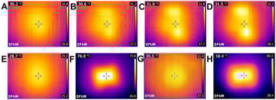 Representative images of temperatures reached by polymeric films with and without GnRs, irradiated with the near-infrared NIR laser. Control film, room temperature and no irradiation (A). Control film after 10 s of irradiation (B). Control film after 20 s of irradiation (C). Control film after 30 s of irradiation (D). CTAB-GnRs film, no irradiation (E). CTAB-GnRs film irradiated for 15 s (F). PEG-GnRs film, no irradiation (G). PEG-GnRs film irradiated for 15 s (H).