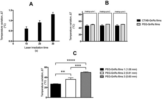 Temperature increase of polymeric film without GnRs irradiated for different times (A). Temperature increase of polymeric films prepared with CTAB and PEG-GnRs. Each film was irradiated for cycles of 15 s, cooled down, and repeated two more times (B). Temperature increase of polymeric films with different thicknesses, prepared using PEG-GnRs (C) (mean ± SD, n = 3) (** p = 0.0039, *** p = 0.0004, **** p < 0.0001).