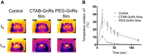 Until further and high-level evidence regarding the safety and toxicological profile of GnRs is gathered, approaches where body exposure to these particles is limited or avoided should be used. In the present work, CTAB-GnRS were prepared by the seed-mediated method [] and functionalized with thiolated poly(ethylene) glycol (mPEG-SH) []. Both types of GnRs were characterized and then included in polymeric crosslinked films, evaluating their effect on film structural properties through mechanical, swelling, and thermal analyses. Finally, the heating capacity of films upon laser irradiation and the transfer of heat to a skin model were tested to evaluate the possible application of GnR-loaded films for local skin hyperthermia.