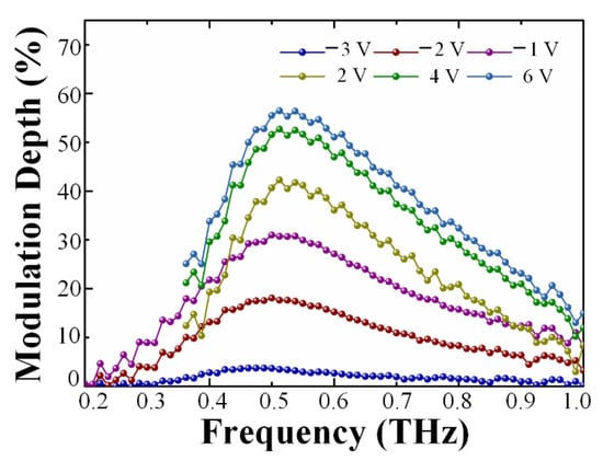 where TVg is the measured transmittance of a sample at a specific gate voltage, and Tmax is the maximum transmittance among different voltages. The experimental MD is demonstrated in Figure 3. The curves indicate that the optimum operating band is around 0.5 THz. Corresponding to the Tmax occurring at −3.5 V, the maximum MD is 55% at 6 V. The relationship between gate voltage and MD is non-linear. In detail, the increased rate of MD gradually slows down, with the applied voltages shifting away from the Dirac point.
