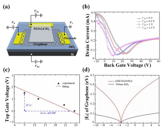 We adopted a so-called dual-grating-gate configuration, demonstrated in Figure 4a, to obtain the capacitance of PEO:LiClO4 [43]. As the doping level of SLG is simultaneously controlled by thetop-gate and back-gate, the shift of CNP should follow the relationship defined by where Cg and CSiO2 are the capacitance of the solid electrolyte and the 300 nm SiO2/Si (0.0121 μFcm−2) respectively [18,19,20], and VBG,CNP is the back-gate voltage of CNP. Figure 4b shows several transfer characteristic curves measured by dual-grating-gate configuration when the top-gate is set as 0 V, 0.5 V, 1 V, and 1.5 V, respectively. Accompanied by an increase in VTG, the Dirac point moves to left gradually. The specific movement rule of CNP is shown in Figure 4c. The value of the fitting curve, , is 10, which means the capacitance of spin-coated electrolyte is 10 times larger than that of a 300 nm SiO2 plane-parallel capacitor. Eventually, the free carrier concentration of electrolytes under various VTG could be theoretically predicted by the following equation [20,27,38].