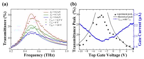 Theoretical results compared with experimental ones in the proposed modulator. (a) THz transmission spectra with different Fermi levels illustrated, both in practice and in theory. According to the previous analysis, the Fermi level is 0.15 eV, 0.28 eV, and 0.39 eV when VTG is set as −4.5 V, 0 V, and −10 V, respectively. (b) The transmittance summits of prediction and of measurement versus gate voltages, shown by black lines and dots, respectively. The transfer characteristic curve of the designed modulator was demonstrated at source-drain voltage 0.1 V, in the blue dots and line.