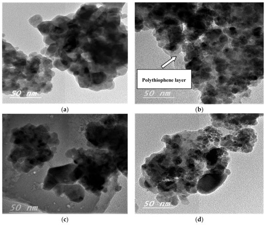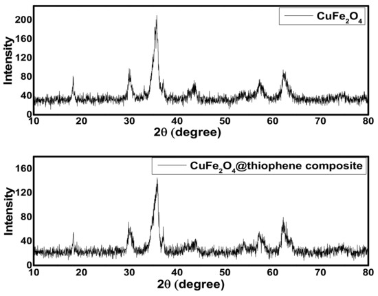As shown in Figure 1, the XRD patterns of both CuFe2O4 and CuFe2O4@thiophene composite indicated that the main phase of both samples was cuprospinel. The diffraction pattern of CuFe2O4@Polythiophene composite showed six sharp peaks at 19.1°, 30.8°, 36.4°, 44.2°, 58.7° and 62.8° corresponding to (80), (100), (201), (50), (55) and (88) of CuFe2O4.The crystalline size of CuFe2O4 and CuFe2O4@Polythiophene composite was calculated by Scherer equation (i.e., Equation (7)) [22]. It was 9.1 and 21.1 nm for CuFe2O4 and CuFe2O4@Polythiophene composite, respectively.